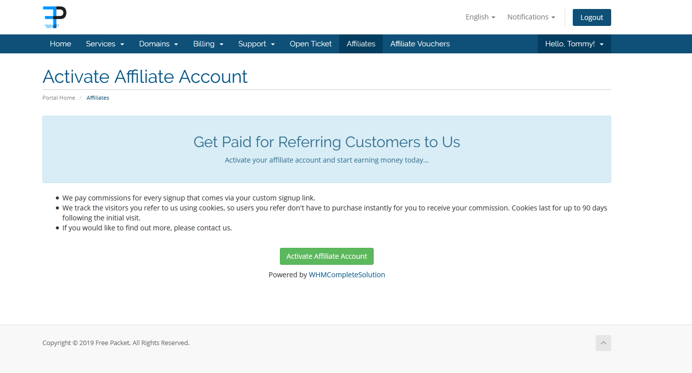 Once you have registered your account and verified your eMail address, You will need to activate the affiliates page. Click on Affiliates at the top.Then simply click the Activate Affiliates Account Button.